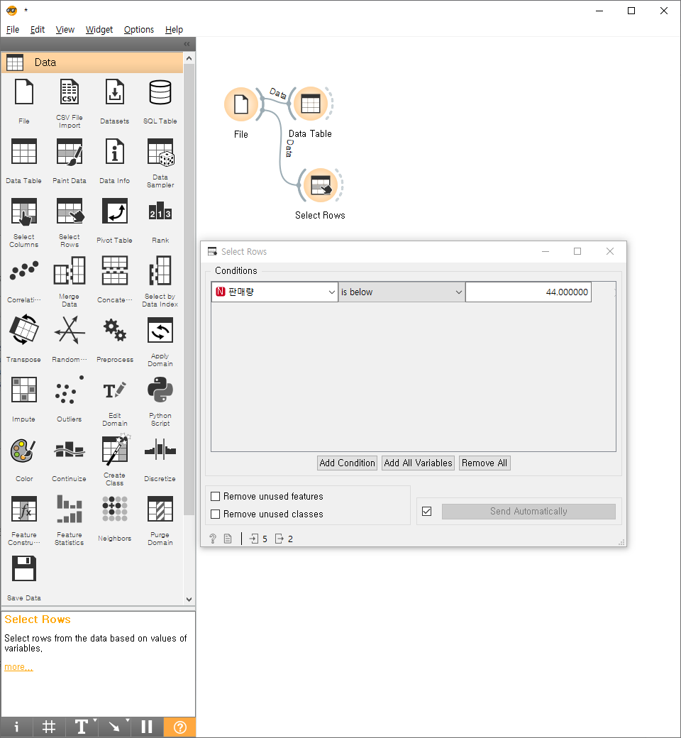 조건을 걸려면, 아까처럼 오른쪽 원호에 클릭-드래그하면 나오는 목록 중 Select rows를 선택한 후 해당 블록을 더블클릭해보자.