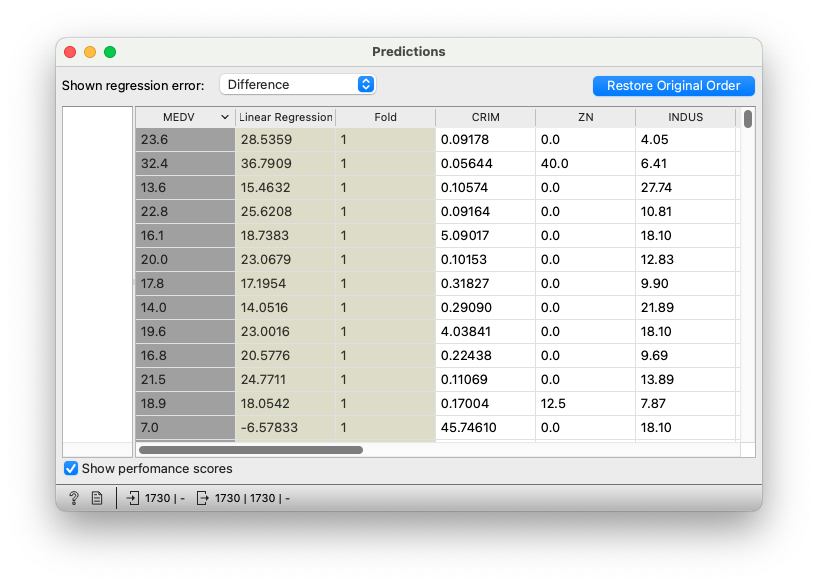 모델의 예측 결과를 시각화하기 위해 ‘Predictions’ 위젯을 추가합니다. ‘Test & Score’ 위젯과 연결하여 실제 값과 예측 값을 비교할 수 있습니다. 이를 통해 모델의 예측이 실제 값과 얼마나 가까운지 확인할 수 있습니다.