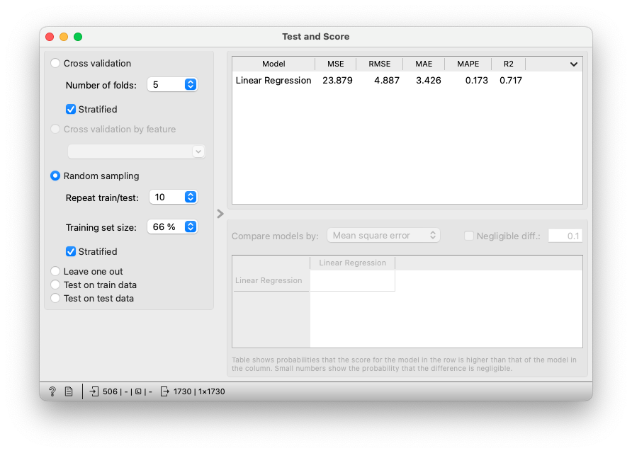 모델의 성능을 평가하기 위해 ‘Test & Score’ 위젯을 사용합니다. ‘Linear Regression’ 위젯과 연결하고, ‘File’ 위젯과도 연결하여 데이터를 테스트합니다. ‘Test & Score’ 위젯에서는 평균 절대 오차(Mean Absolute Error, MAE), 평균 제곱 오차(Mean Squared Error, MSE) 등의 성능 지표를 확인할 수 있습니다. 이러한 평가 지표를 통해 모델이 얼마나 잘 동작하는지 파악할 수 있습니다.